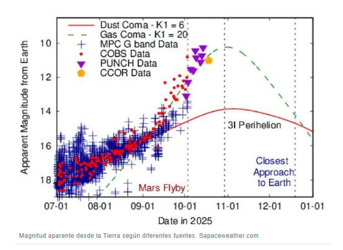 «¡Es un reto infernal!», grita el experto Karl Battams. «Usamos trucos de apilamiento de imágenes para rastrear esta ‘sombra fantasmal’ en el umbral de la detección. ¡Si brilla más o cambia de rumbo, LO SABREMOS AL INSTANTE!». Y los datos no mienten: una curva de luz explosiva compilada por T. Marshall Eubanks muestra que 3I/ATLAS brilla como un cometa normal… ¿o es solo un disfraz perfecto para una sonda extraterrestre?
