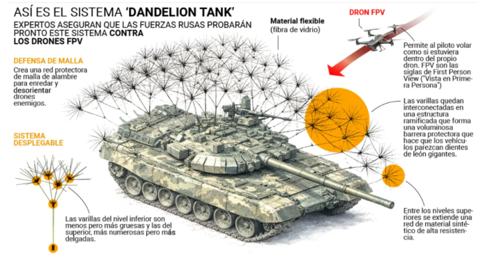 ¡Rusia evoluciona su armadura contra el arma reina de Ucrania: los drones FPV! El nuevo sistema patentado, apodado «Dandelion Tank» (tanque diente de león) en redes sociales, transforma los blindados en gigantes espinosos con docenas de varillas metálicas ramificadas y flexibles sujetas al casco, diseñadas para detonar o desviar drones kamikaze antes de que impacten en puntos vitales. ¡Un invento que recuerda a las púas antiaves en tejados, pero a escala bélica, y que podría debutar pronto en el frente ucraniano tras años de «cope cages», «turtle tanks» y «hedgehog» con cables de aluminio! En una guerra donde los FPV han destruido miles de tanques rusos, este «traje» busca elevar la protección pasiva al siguiente nivel, con varillas de fibra de vidrio o metal que se interconectan en niveles –más delgadas arriba, gruesas abajo– y una red de kevlar superior como cúpula. ¿Efectivo contra enjambres ucranianos, o solo un parche visual?