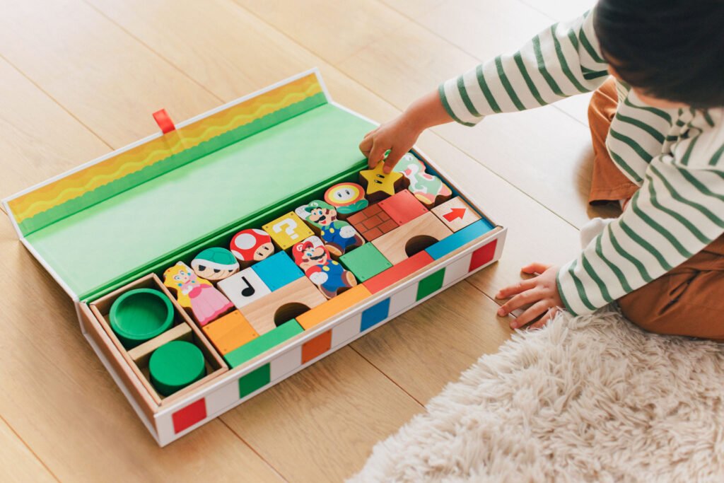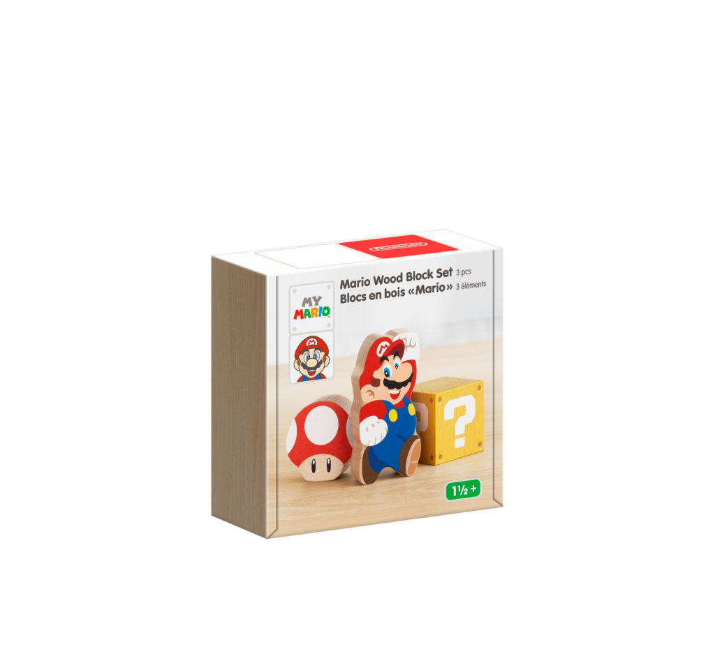 - Dos sets de bloques de madera protagonizados por Mario y por otros elementos bien conocidos de la serie Super Mario: un set de bloques de madera de Mario (tres piezas) y un set de bloques de madera de Mario y sus amigos (30 piezas).